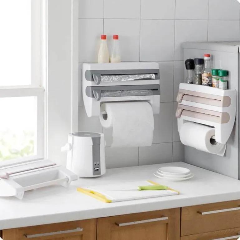 Dieser Organizer verfügt über zwei Schneidearten: eine runde Klinge zum effizienten Schneiden von Alufolie und Ölpapier und eine dreieckige Klinge speziell für Frischhaltefolie. Er bietet außerdem zusätzlichen Platz oben für die Aufbewahrung von Gewürzen, sodass Sie alles, was Sie brauchen, immer griffbereit haben.