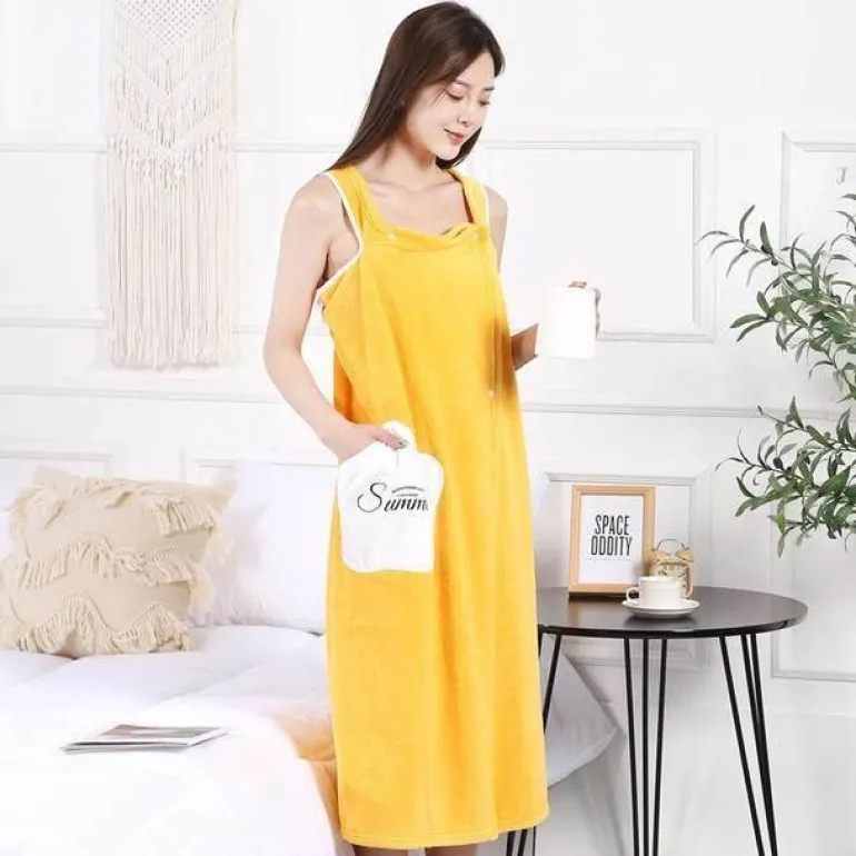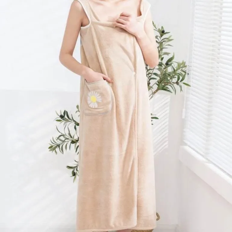 Entdecken Sie unübertroffenen Komfort mit unserem innovativen tragbaren Bademantelkleid, ideal zum Entspannen nach dem Bad. Dieses einzigartige Badetuchkleid vereint die lässige Eleganz eines locker sitzenden Sommerkleides mit dem mühelosen Tragekomfort – einfach überziehen und die Schuhe ausziehen.