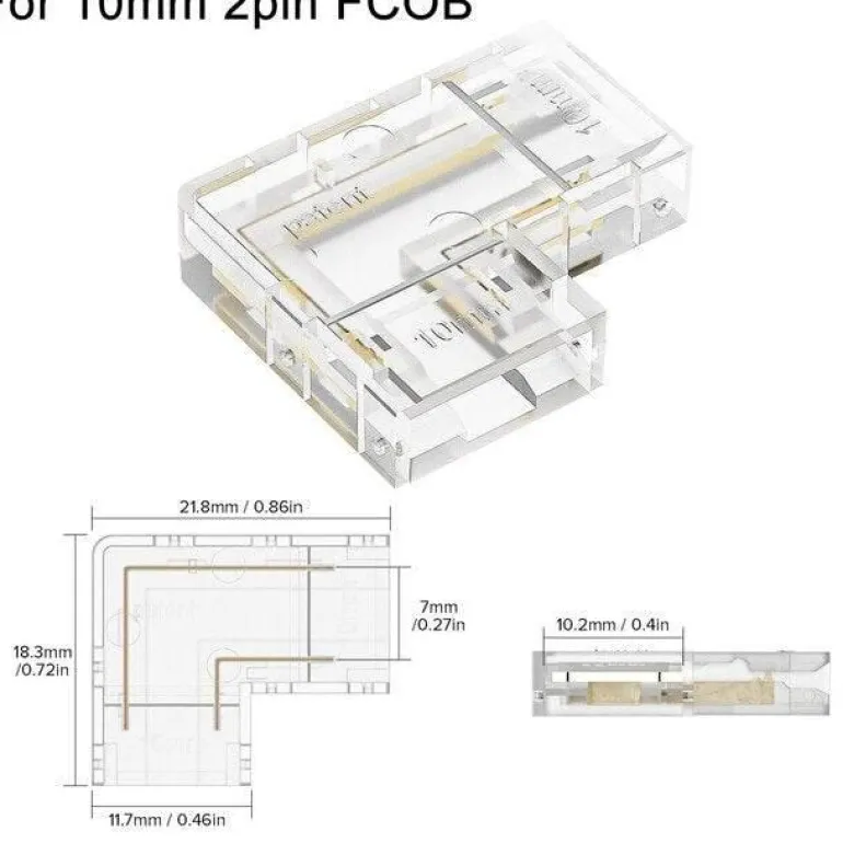 Das L-förmige Design ermöglicht die einfache Installation in Ecken oder anderen rechtwinkligen Konfigurationen und eignet sich daher hervorragend für individuelle Beleuchtungsarrangements. Egal, ob Sie mit FCOB-Streifen mit zwei Stiften (8 mm oder 10 mm) oder drei Stiften (10 mm) arbeiten, dieser Anschluss gewährleistet eine zuverlässige Verbindung.