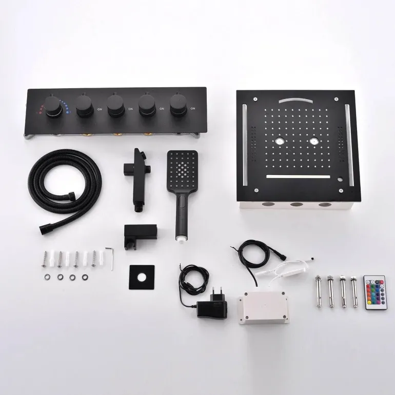 Verwandeln Sie Ihre tägliche Dusche in ein erholsames Spa-Erlebnis mit dem LED-Musik-Duschset im Deckenregen-Stil. Mit lebendiger, mehrfarbiger LED-Beleuchtung und Bluetooth-Musikfunktion bereichert dieses moderne Duschsystem Ihre Baderoutine mit einer perfekten Mischung aus Licht und Klang. Der großzügige 30 cm große Regenduschkopf erzeugt einen sanften Wasserfall, der die beruhigende Atmosphäre der Natur nachahmt. Die robuste Konstruktion und die elegante, geschwärzte Oberfläche verleihen Ihrem Badezimmer Funktionalität und modernen Stil.