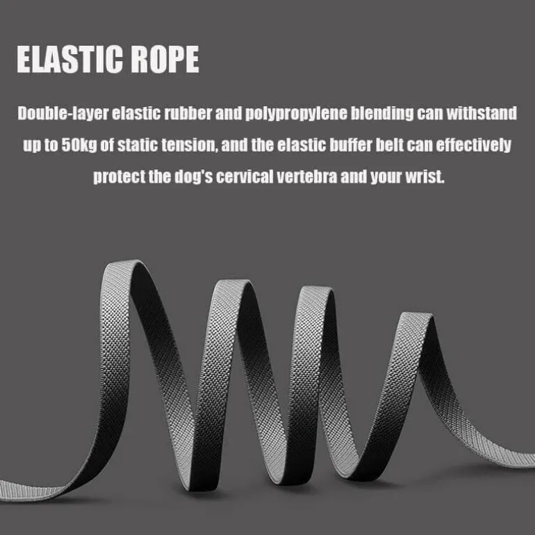 Mit einem einzigartigen elastischen Seil aus einer doppellagigen Mischung aus elastischem Gummi und Polypropylen hält diese Leine einer statischen Spannung von bis zu 50 kg stand. Dieser elastische Puffer schützt sowohl die Halswirbel Ihres Hundes als auch Ihr Handgelenk vor plötzlichen Zugkräften. Das flache Design des Zugseils verhindert ein Aufrollen beim Spannen und sorgt so für ein angenehmes und ruhiges Laufgefühl. Dank der großzügigen Länge von 2,6 Metern kann sich Ihr Haustier frei bewegen, während Sie in jeder Notsituation die Kontrolle behalten.