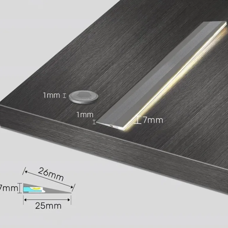 Dieses aus robustem Aluminium und Silikon gefertigte Lichtpanel verleiht jeder Umgebung eine elegante, moderne Ästhetik. Es ist in den Längen 30 cm, 40 cm, 50 cm und 100 cm (11,81 Zoll, 15,75 Zoll, 19,69 Zoll und 39,37 Zoll) erhältlich und lässt sich so problemlos in verschiedene Umgebungen integrieren. Mit einer minimalen Breite von 25 mm und einer Höhe von nur 7 mm (0,98 Zoll x 0,28 Zoll) lässt sich das Panel diskret installieren und fügt sich harmonisch in Ihren Raum ein.