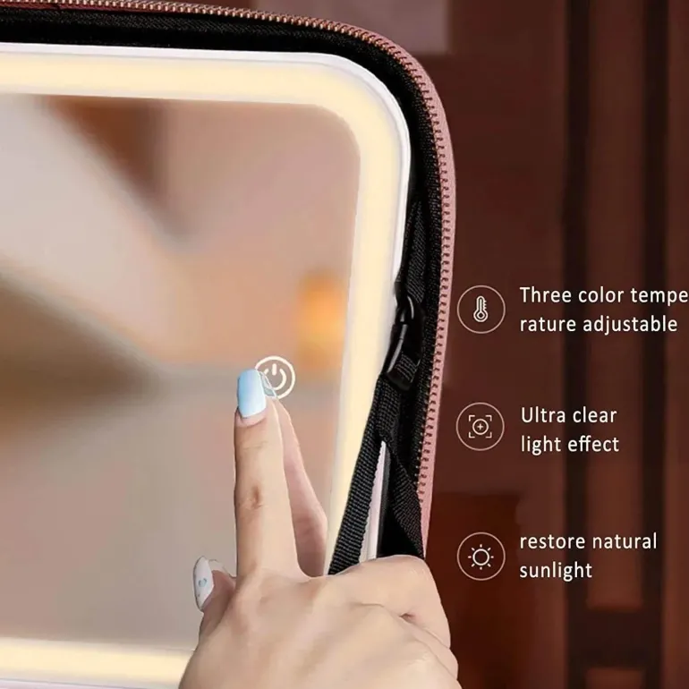 * **Doppelfunktion:** Diese Tasche kombiniert nahtlos die Zweckmäßigkeit eines Kosmetikkoffers mit dem Luxus eines eingebauten beleuchteten Spiegels und ist somit perfekt zum Schminken – jederzeit und überall.