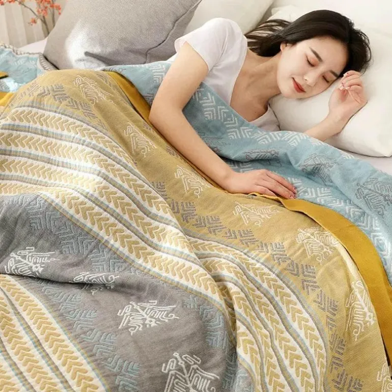 Mit ihrem raffinierten, japanisch inspirierten Design und dem einzigartigen geometrischen Muster fügt sich diese Decke nahtlos in jedes Dekor ein. Der speziell gefertigte Stoff fördert die Atmungsaktivität und sorgt dafür, dass Sie in den Sommermonaten kühl und erfrischt bleiben.