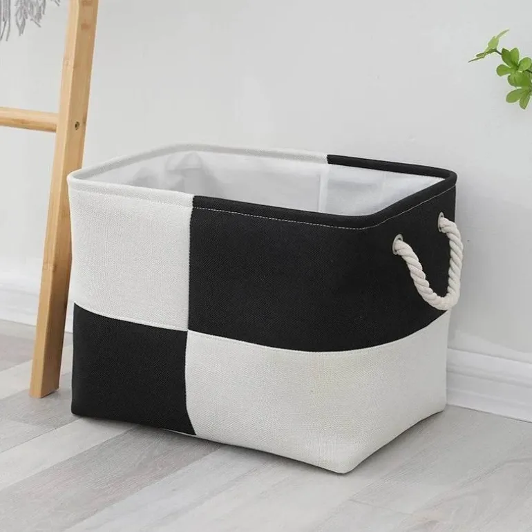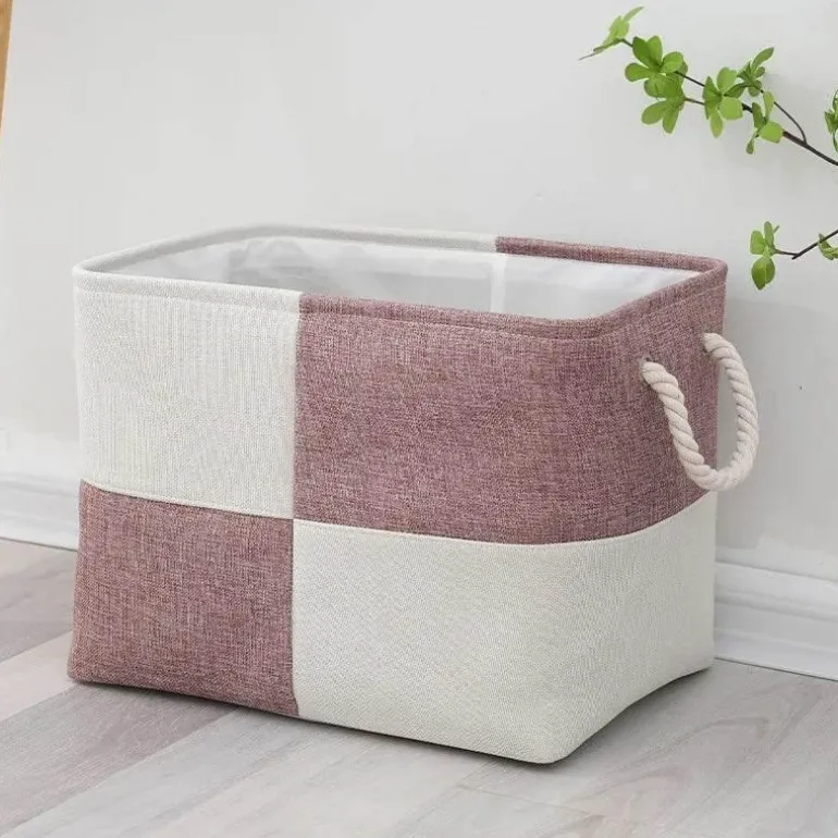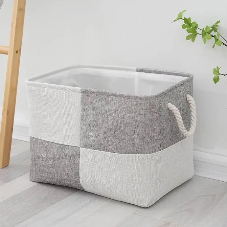 Crafted from a robust linen blend, these chic storage baskets feature a contemporary two-tone design and sturdy twisted rope handles, making them easy to transport. Ideal for organizing a variety of items such as books, toys, or linens, their subtle neutral color scheme seamlessly complements any home decor style.
