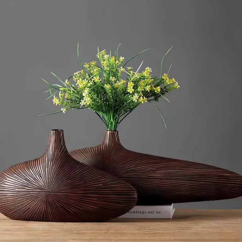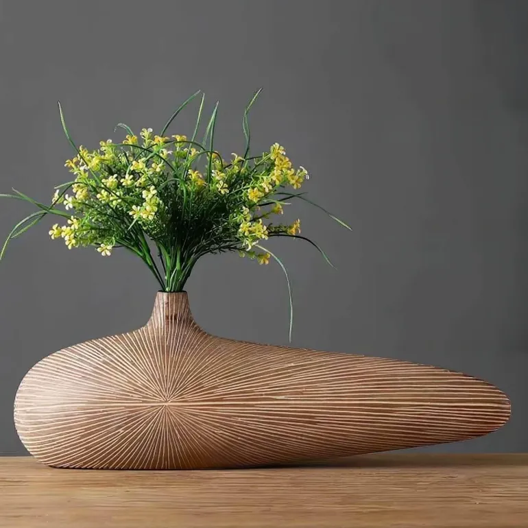 Entdecken Sie die dekorative Vasenkollektion Lucien, in der moderne Ästhetik nahtlos mit klassischem Charme verschmilzt. Jede ovale Vase aus hochwertigem Harz imitiert die natürliche Textur und Wärme von echtem Holz und verleiht Ihrer Einrichtung einen authentischen und luxuriösen Look.