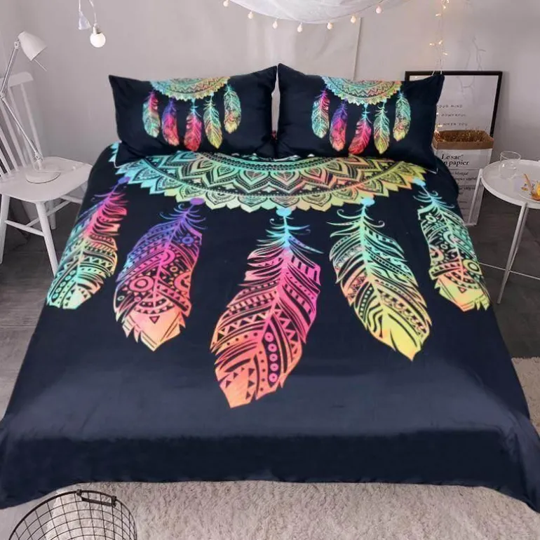 Verwandeln Sie Ihr Schlafzimmer in einen ruhigen Rückzugsort mit diesem luxuriösen Bohemian Dreamcatcher-Bettbezug-Set. Das farbenfrohe Traumfänger-Muster ist mit bunten Federn verziert. Das Set aus weicher Mikrofaser besteht aus einem Bettbezug und zwei Kissenbezügen und verleiht Ihrem Raum eine warme und romantische Atmosphäre.