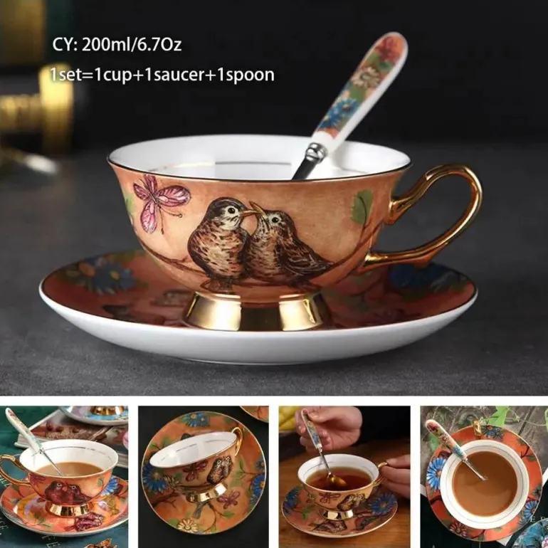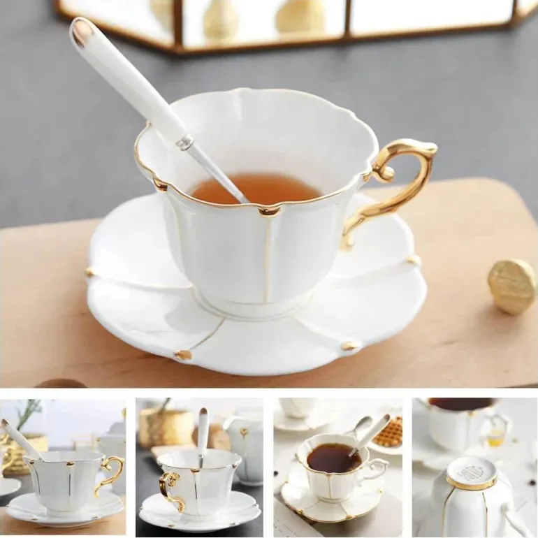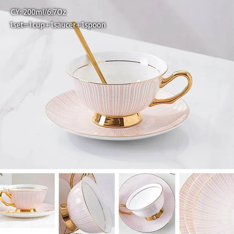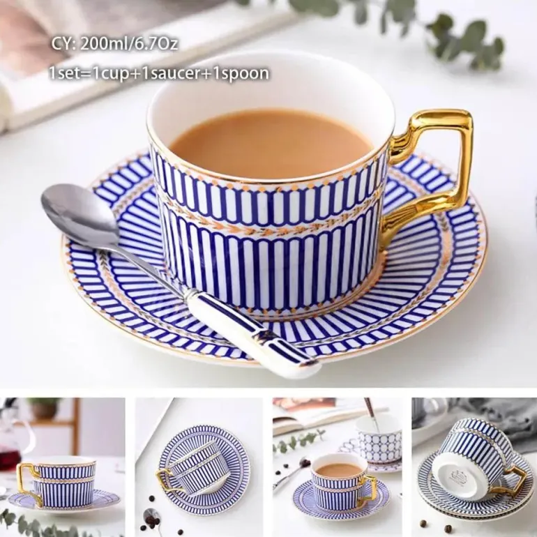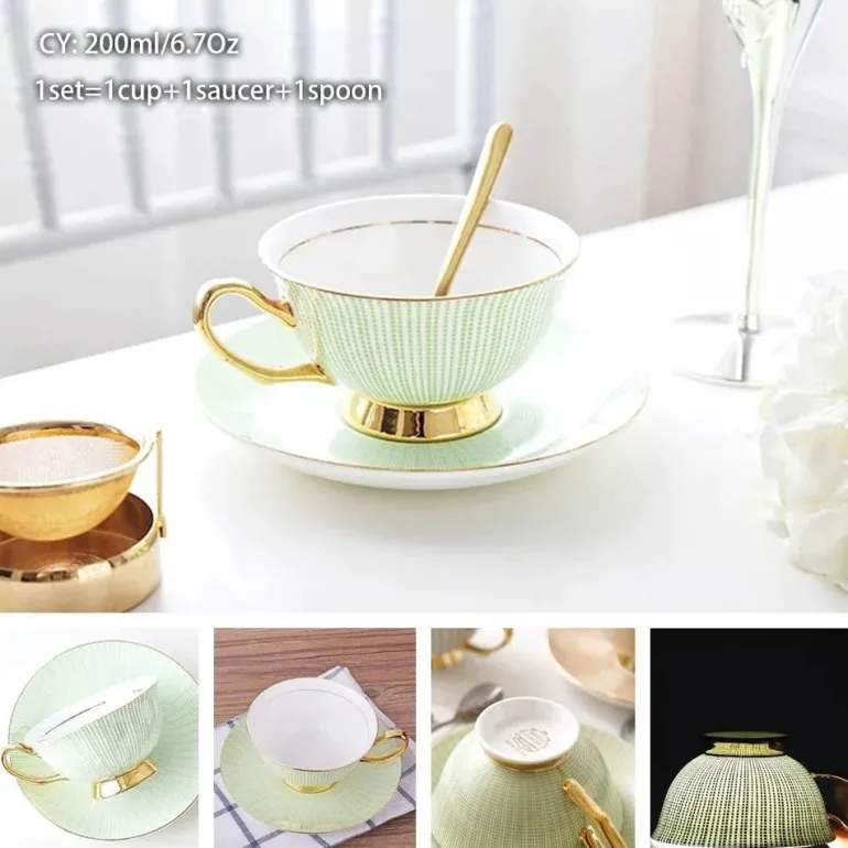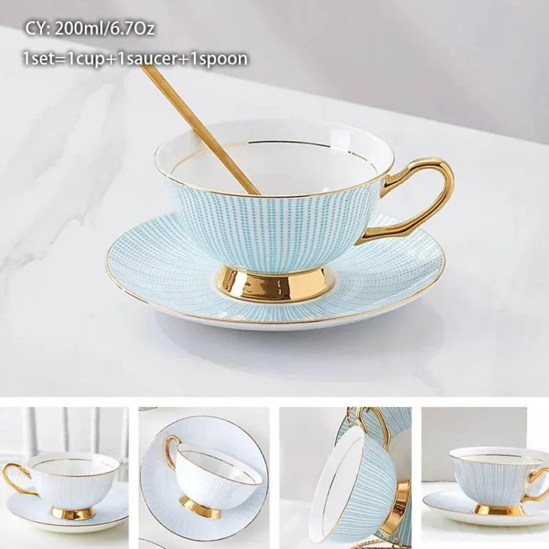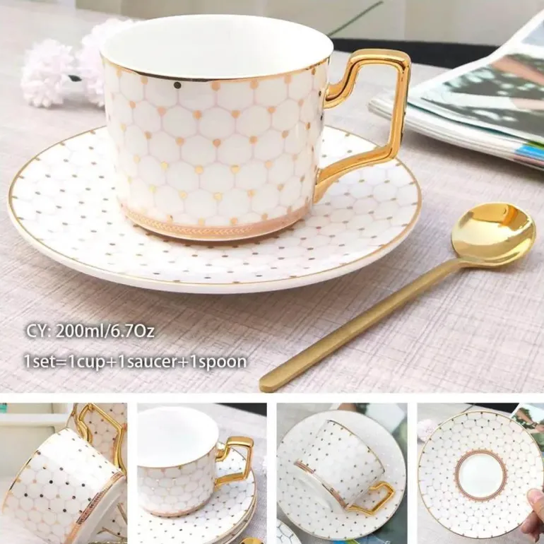 Entdecken Sie die raffinierte Eleganz unseres luxuriösen Kaffeetassen-Sets aus Bone China. Es besteht aus einer wunderschön gefertigten 200-ml-Tasse, einer passenden Untertasse und einem filigran gestalteten Löffel. Dieses exquisite Set wurde sorgfältig entworfen, um Ihr Kaffeeerlebnis zu veredeln und spiegelt Raffinesse und stilvollen Charme wider.