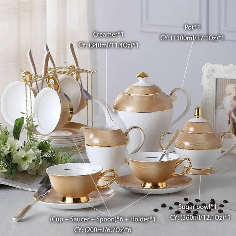 Erleben Sie den raffinierten Charme unseres luxuriösen Kaffee- und Teeservices aus goldenem Bone China, meisterhaft gefertigt von Freeson. Diese elegante Trinkgeschirrkollektion mit über acht Teilen besteht aus hochwertigem Bone China, das für seine beeindruckende Haltbarkeit, brillante Verarbeitung und exquisite Transparenz bekannt ist. Das Design vereint harmonisch europäische, britische und königliche Einflüsse und eignet sich sowohl für den täglichen Genuss als auch als besonderes Geschenk.