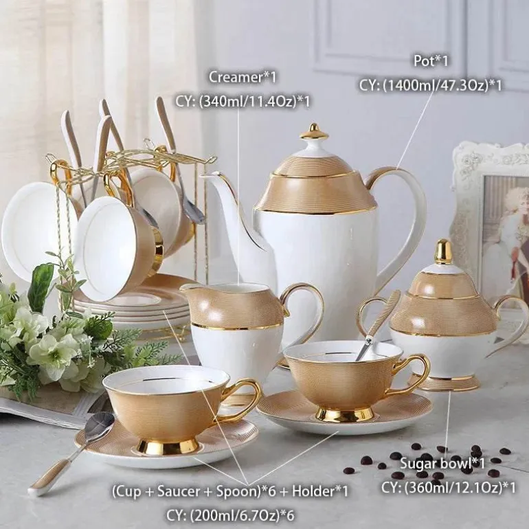 Genießen Sie die Eleganz dieses luxuriösen Kaffee- und Teeservices aus Bone China, das sorgfältig gefertigt wurde, um Ihr Teeerlebnis zu veredeln. Diese exquisite Kollektion umfasst über acht Teile, die Ihren Zusammenkünften eine Mischung aus Eleganz und Charme verleihen.