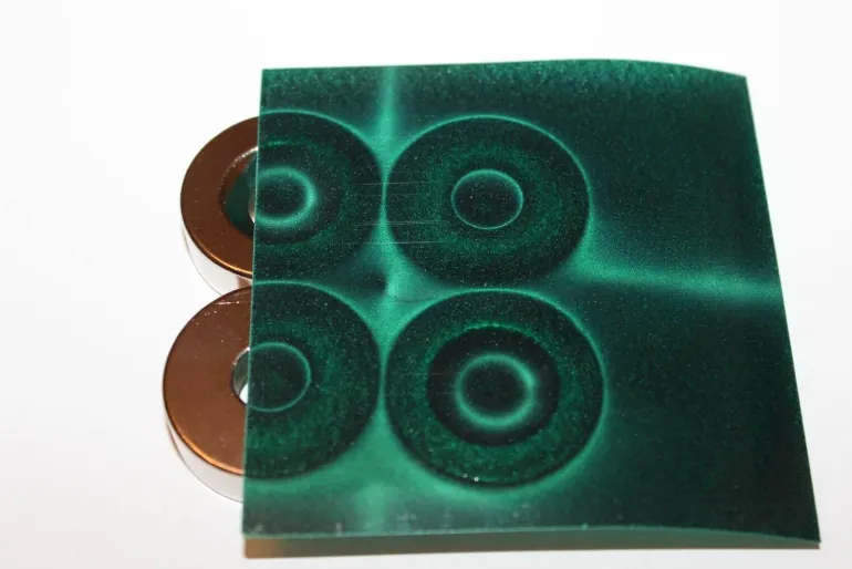 Dieser leichte und kompakte Film lässt sich bequem transportieren und ist somit eine praktische Ergänzung für jeden Werkzeugkasten. Er eignet sich hervorragend als Lehrmittel und weckt Neugier und Interesse an den Naturwissenschaften. Die mikroverkapselte Struktur des Films ermöglicht die mühelose Visualisierung statischer Magnetfelder.