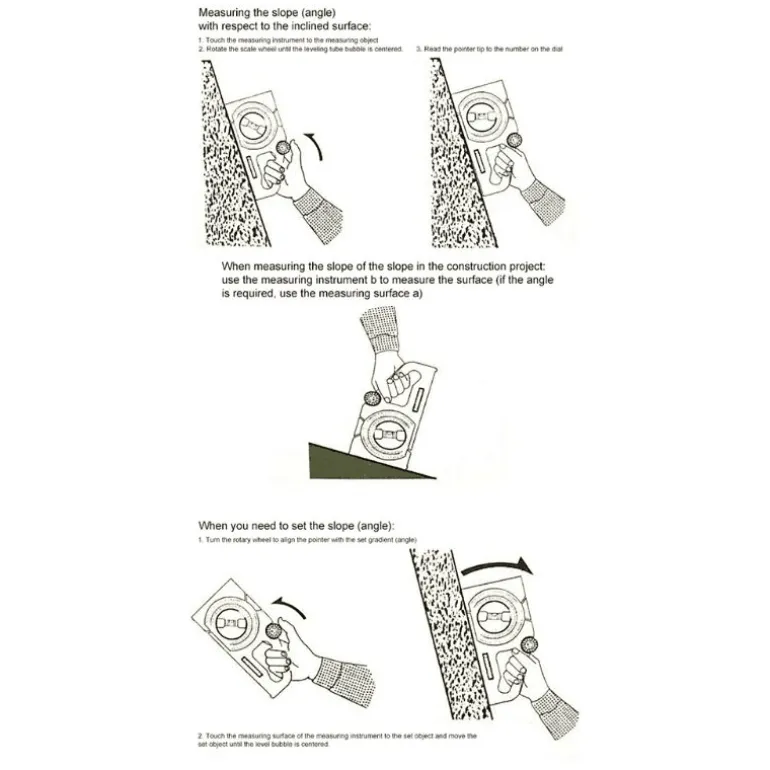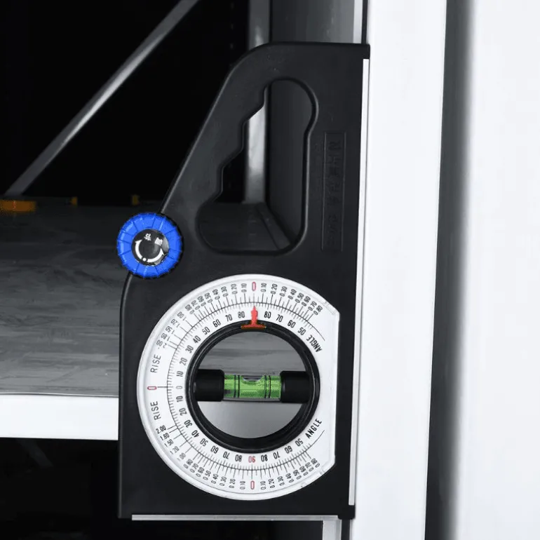 Der multifunktionale Winkel- und Neigungsmesser verfügt über einen ergonomischen Griff für komfortables Halten und einfache Bedienung. Dank der übersichtlichen Vergleichstabelle für Neigungs- und Winkelmessungen ermöglicht dieses Gerät ein müheloses Ablesen der Skalen und eignet sich ideal für Neigungsmessungen und Neigungseinstellungen.