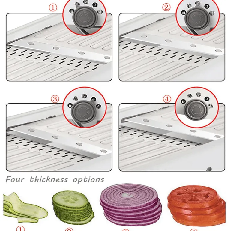 Mit der Schneidefunktion können Sie Gemüsescheiben von 1,8 mm bis 6 mm Dicke schneiden. So können Sie Ihre Bambussprossen, Gurken, Radieschen und andere Zutaten mit nur einer Drehung individuell an Ihre Kochbedürfnisse anpassen und erhalten verschiedene Dicken.