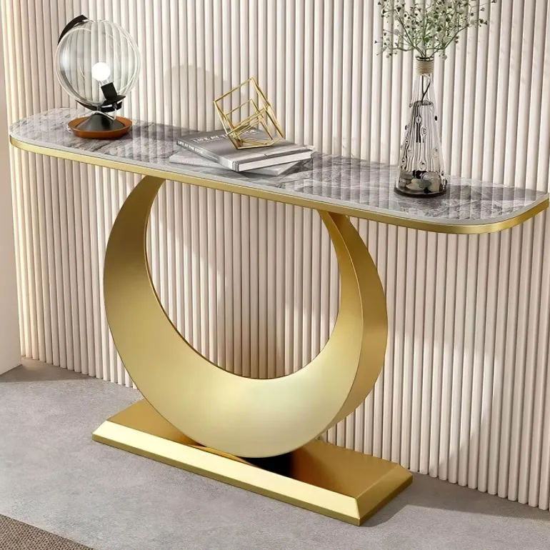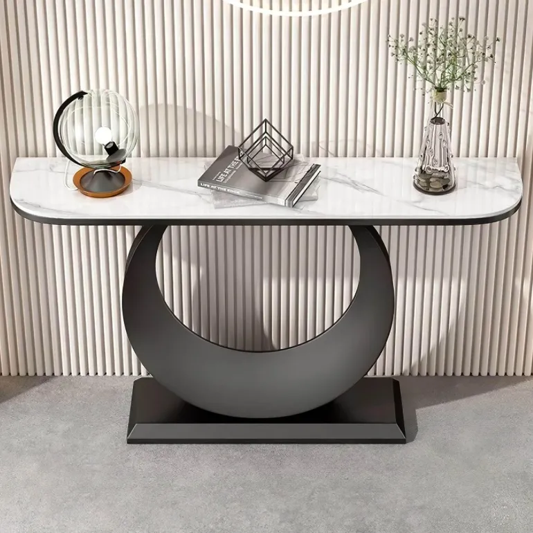 Wir präsentieren den Konsolentisch Marie, ein stilvolles und praktisches Möbelstück, das Ihren Flur oder Wohnbereich verschönert. Dieser moderne Konsolentisch im Mid-Century-Stil ist sorgfältig gefertigt und verfügt über einen robusten Stahlfuß, der Stabilität und Eleganz bietet, gepaart mit einer markanten Schieferplatte, die ihm einen Hauch von Raffinesse verleiht. Das Design zeichnet sich durch einen schlanken und kunstvollen, soliden Rahmen aus, der sich nahtlos in verschiedene Einrichtungsstile einfügt und ihn zu einer vielseitigen Ergänzung für Ihr Zuhause macht. Mit seiner Kombination aus Form und Funktion bietet der Konsolentisch Marie viel Ablagefläche zum Präsentieren von Dekorationsgegenständen oder zum Aufbewahren wichtiger Dinge. Werten Sie Ihren Eingangsbereich oder Ihr Wohnzimmer mit diesem charmanten Stück auf, das Schönheit und Funktionalität vereint. Verwandeln Sie Ihren Raum noch heute mit dem Konsolentisch Marie.