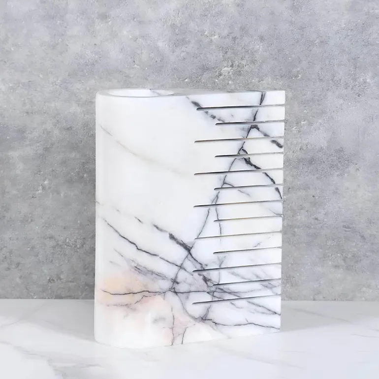 Ob allein oder mit atemberaubenden Blumenarrangements – diese Marmorvase verleiht Ihrem Wohnraum einen Hauch von Erhabenheit und Prestige. Ihr vielseitiges Design ergänzt verschiedene Einrichtungsstile und fügt sich nahtlos ein, ohne dabei zu vernachlässigen. Dieses Stück unterstreicht nicht nur Ihre Ästhetik, sondern dient auch als praktische Lösung, um Ihre Lieblingsblumen oder Dekorationselemente in Szene zu setzen.