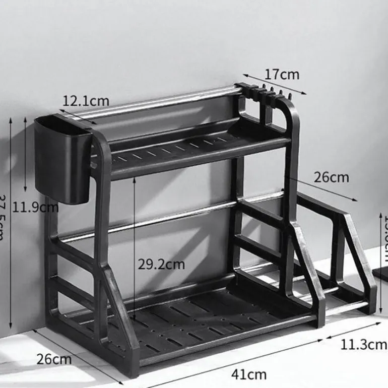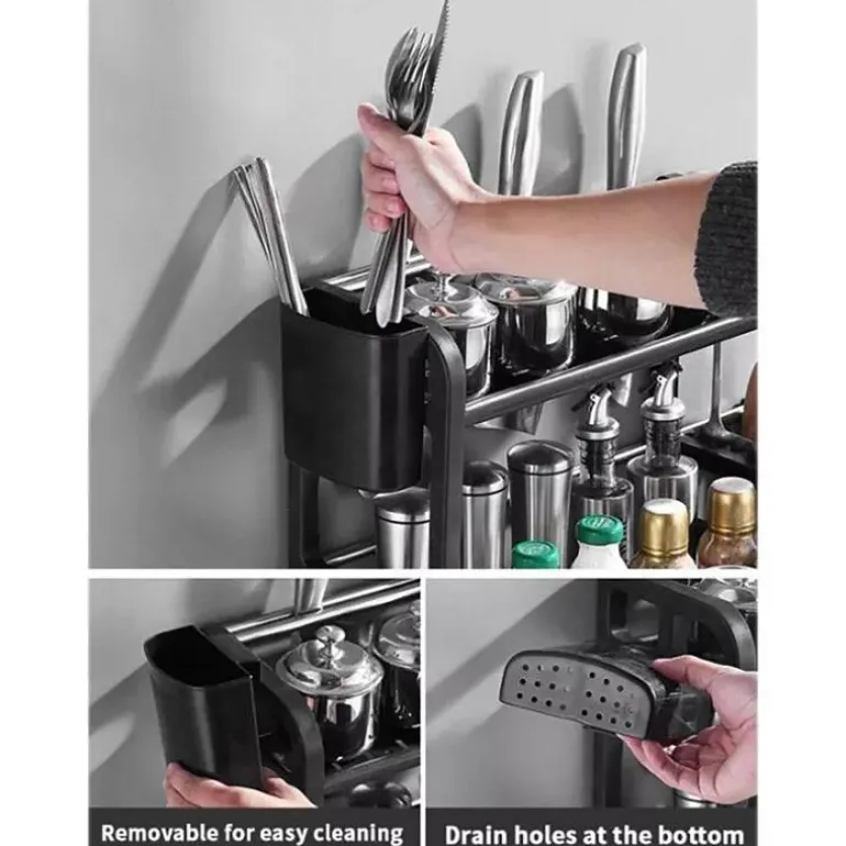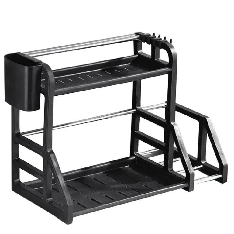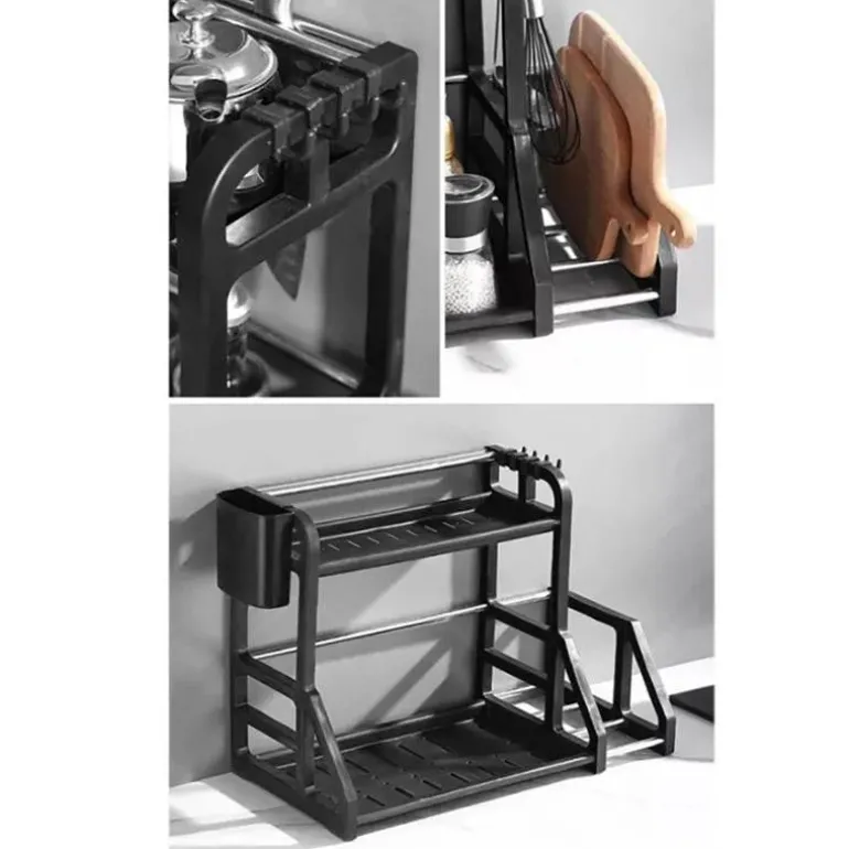 Das mehrstöckige Küchenregal erfüllt die täglichen Bedürfnisse Ihrer Familie und bietet eine praktische Lösung für die Organisation Ihrer Küchenutensilien. Die doppellagige Struktur bietet ausreichend Platz für Geschirr, während der integrierte, hängende Essstäbchenhalter mit seinem cleveren Hohlablaufdesign für optimale Belüftung und schnelles Trocknen der Utensilien sorgt.