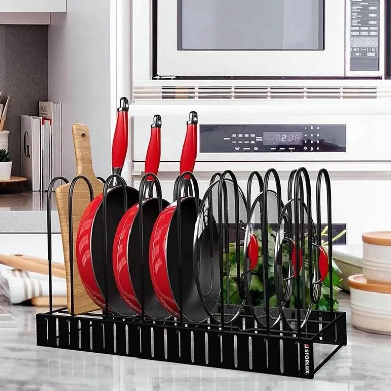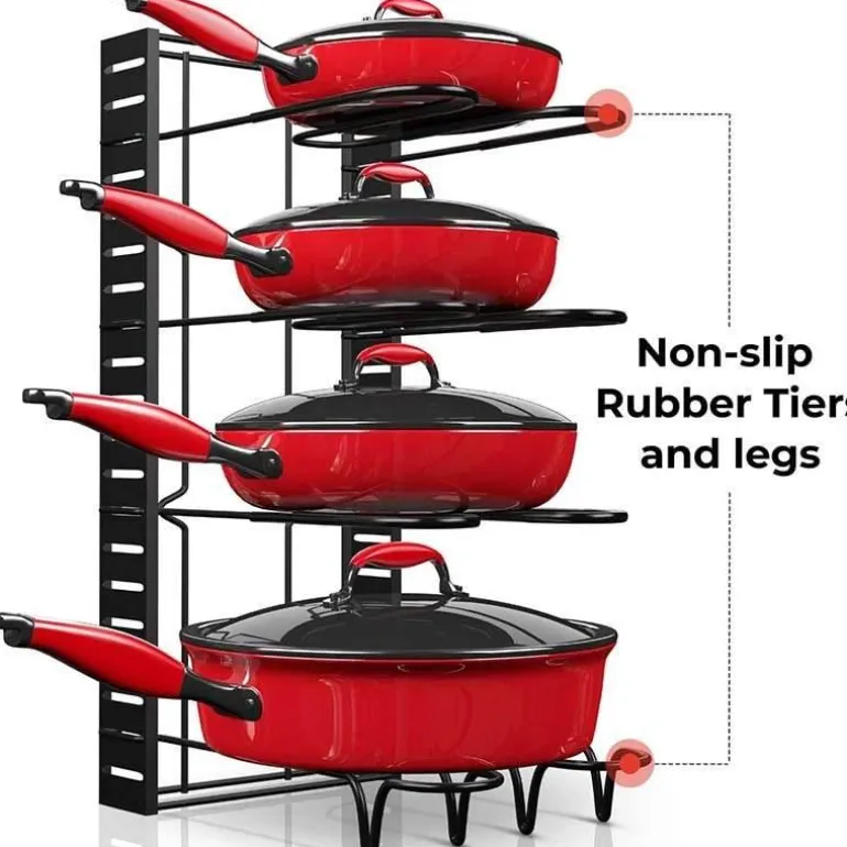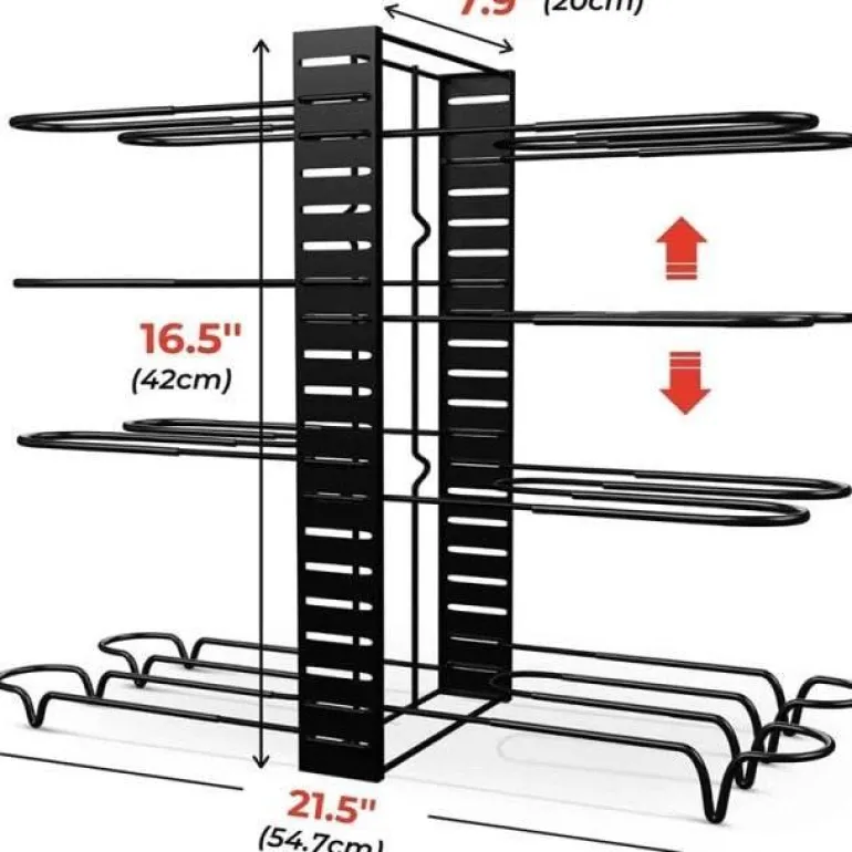 Maximieren Sie Ihren Küchenstauraum mit diesem vielseitigen, mehrstufigen, verstellbaren Pfannenhalter für 8 oder mehr gestapelte Töpfe und Pfannen. Das kompakte Design optimiert den Platz in Küchenschränken, Vorratskammern und auf Arbeitsplatten und sorgt dafür, dass Ihr Kochgeschirr stets griffbereit und übersichtlich ist.