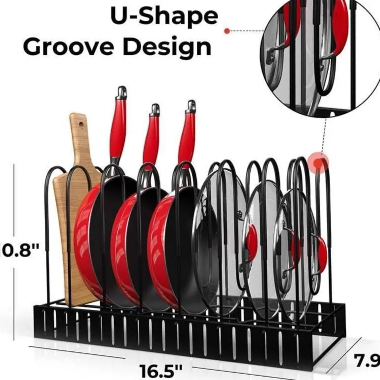 Darüber hinaus erleichtern die anpassbaren Größen und die Ausrichtung dieses Kochgeschirrständers die Organisation von Töpfen, Pfannen, Deckeln, Tabletts, Tellern, Backblechen und Schneidebrettern und sorgen dafür, dass bei der Essenszubereitung alles übersichtlich angeordnet und leicht erreichbar ist.