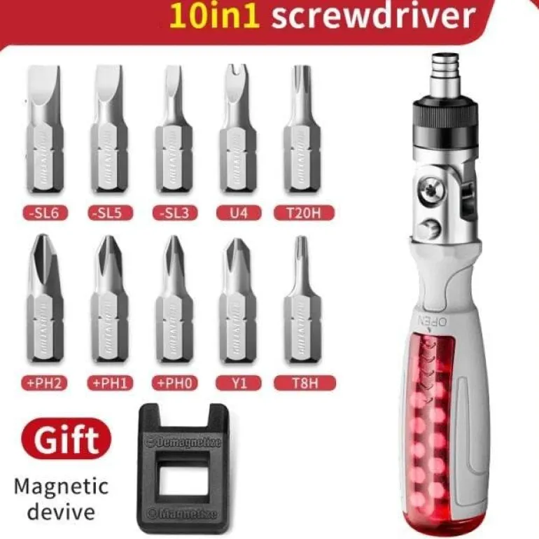 Entdecken Sie die Vielseitigkeit des Mehrwinkel-Schraubendreher-Sets – ein unverzichtbares Werkzeugset für Ihr Heimwerken. Dieses durchdachte Set enthält verschiedene Köpfe, sodass Sie für jede Aufgabe den perfekten Aufsatz haben. Die Schäfte aus robustem Chrom-Vanadium-Stahl bieten außergewöhnliche Festigkeit und Langlebigkeit, während die Gummigriffe einen komfortablen und sicheren Halt bieten. Praktisch verpackt in einer Tragetasche bietet dieses Set die Flexibilität für unterwegs.