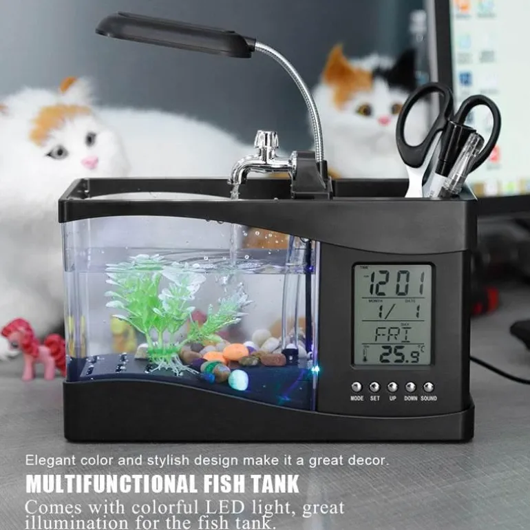 Verschönern Sie Ihre Einrichtung mit diesem multifunktionalen Mini-Aquarium. Das übersichtliche LCD-Display zeigt Uhrzeit, Datum und Temperatur an. Die leuchtende LED-Beleuchtung erhellt das Aquarium nicht nur wunderschön, sondern schafft auch eine lebendige Umgebung für Ihre Fische.