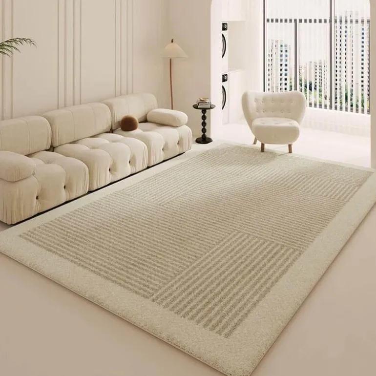 Der Teppich besticht durch sein schlichtes geometrisches Streifendesign in einem satten Cremeton und verkörpert eine minimalistische Ästhetik, die zu vielen Einrichtungsstilen passt. Seine robuste Konstruktion garantiert eine lange Lebensdauer, während die Waschbarkeit eine einfache Pflege ermöglicht.