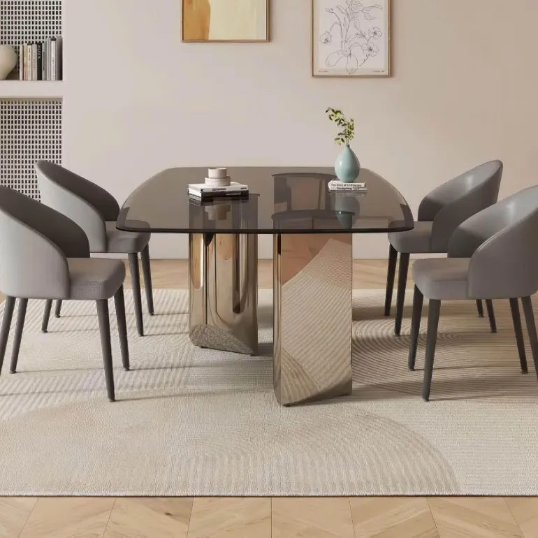 Der moderne Esstisch aus Holz besticht durch eine elegante Tischplatte aus gehärtetem Glas, die das natürliche Licht elegant reflektiert und so den großzügigen Eindruck Ihres Essbereichs unterstreicht. Die transparente Oberfläche schafft eine offene und einladende Atmosphäre und sorgt dafür, dass jede Mahlzeit zu einem Genuss wird.