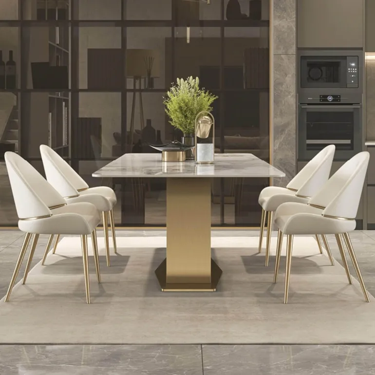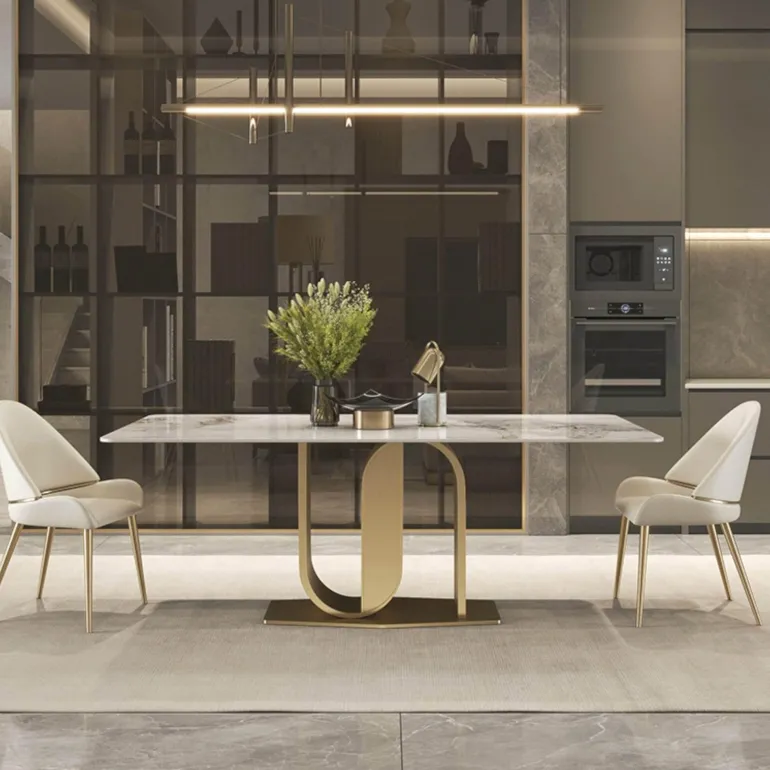 Der Tisch wird von einem stabilen, goldenen Edelstahlrahmen getragen und verkörpert ein raffiniertes Design, das klare Linien mit feinen Details elegant verbindet. Diese Kombination sorgt für optische Akzente und macht ihn zu einem Blickfang in jedem Raum. Die warme, goldene Oberfläche ergänzt die natürliche Schönheit des Schiefers und macht ihn zu einem faszinierenden Mittelpunkt, der aus allen Blickwinkeln die Blicke auf sich zieht.
