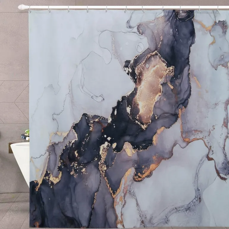 Beleben Sie Ihr Badezimmer mit diesem modernen Duschvorhang, der Funktionalität und Ästhetik gekonnt vereint. Dieses unverzichtbare Accessoire schützt nicht nur Boden und Waschbecken vor Spritzwasser, sondern wertet auch jedes Badezimmer auf. Der Vorhang mit seinem modernen, mehrfarbigen Motiv besticht durch eine schimmernde, silberne Oberseite, die nach unten hin in ein elegantes Marmormuster übergeht. Damit ist er die ideale Wahl für moderne Innenräume.