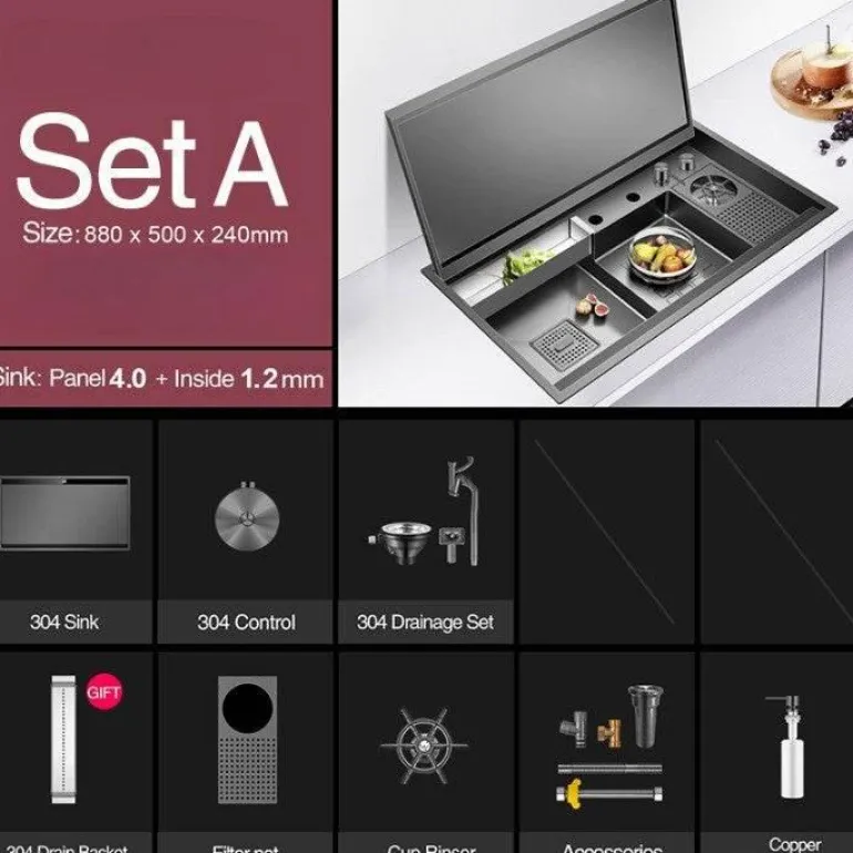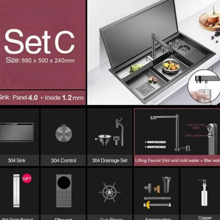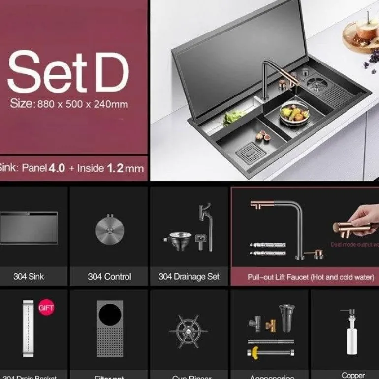 – 1-Tassen-Spüler mit nanometergroßem schwarzen Klappdeckel und versteckter multifunktionaler Spülbeckenfunktion.