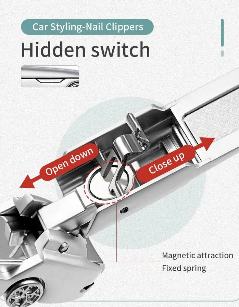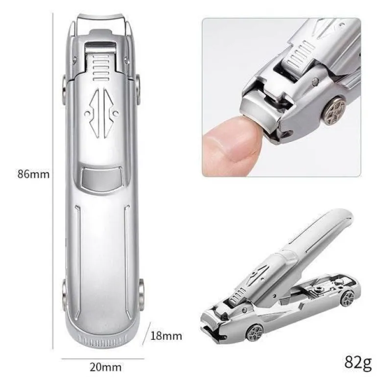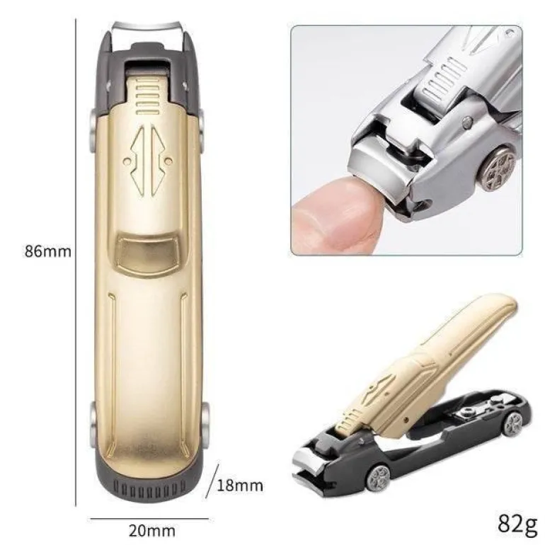 Dank seiner gebogenen Klingen eignet er sich sowohl für Fuß- als auch für Fingernägel und ist somit eine unverzichtbare Ergänzung Ihrer Pflegeroutine. Das spritzwassergeschützte Design sorgt für Ordnung und schützt Ihre Augen während der Anwendung, während die charmante Automobilform für stilvolles Flair sorgt. Dieser Nagelknipser eignet sich sogar als dekoratives Element für Ihr Auto oder Ihren Schminktisch.
