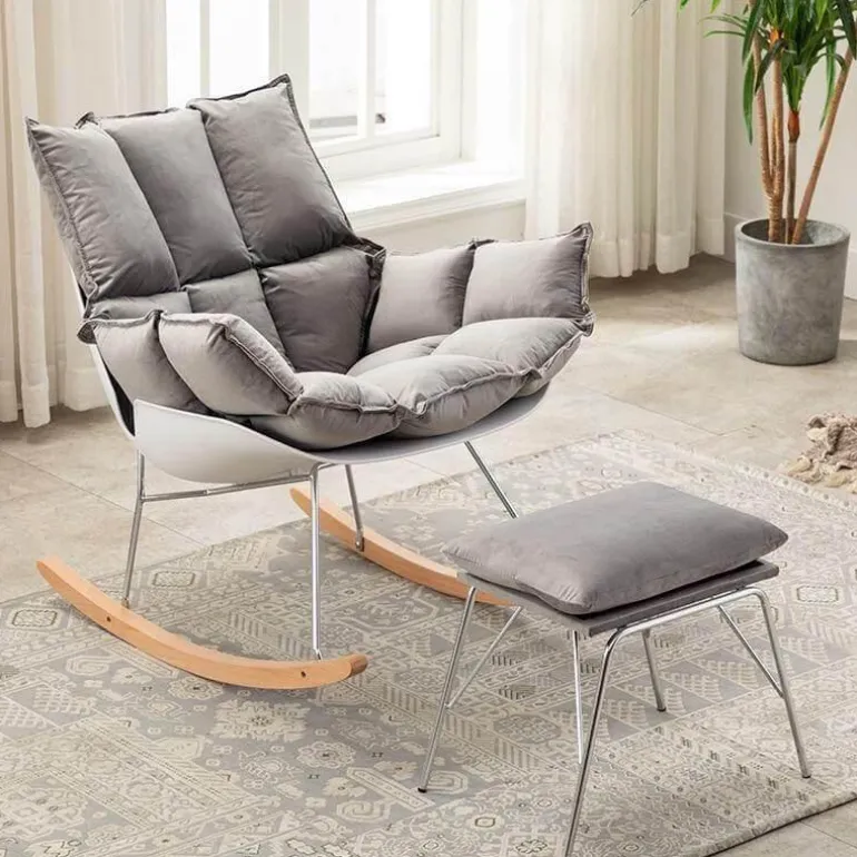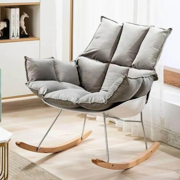 Entdecken Sie den modernen nordischen Schaukelstuhl, eine elegante Ergänzung für Ihren Wohnraum. Sein minimalistisches Design und die moderne Ästhetik vereinen Komfort und Stil harmonisch und machen ihn zur perfekten Ergänzung für jedes moderne Zuhause. Der Stuhl verfügt über stabile Handläufe, die hervorragenden Halt bieten und Ihnen beim Entspannen eine sanfte Schaukelbewegung ermöglichen.