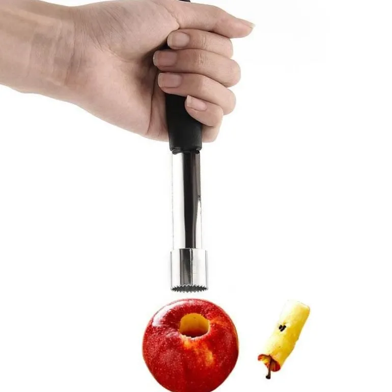 Das Werkzeug besticht durch sein benutzerfreundliches Design: Stecken Sie den Stiel einfach in das Kerngehäuse der Frucht und drehen Sie es, um es mühelos herauszuziehen. Die ultrascharfe Entkernklinge aus Edelstahl garantiert einen sauberen Schnitt, während der Dreh- und Schiebemechanismus das Entfernen des Kerns erleichtert.