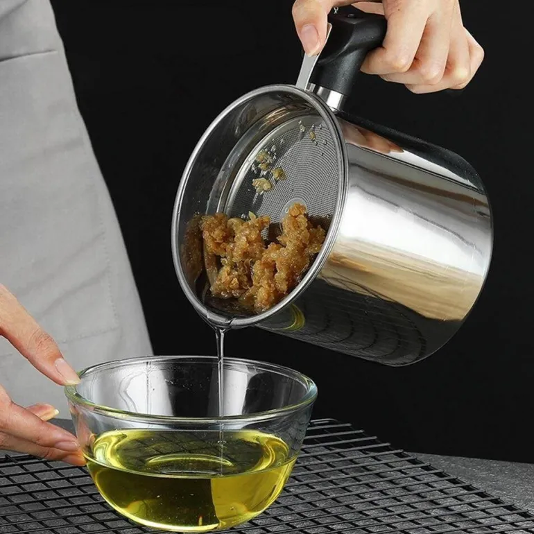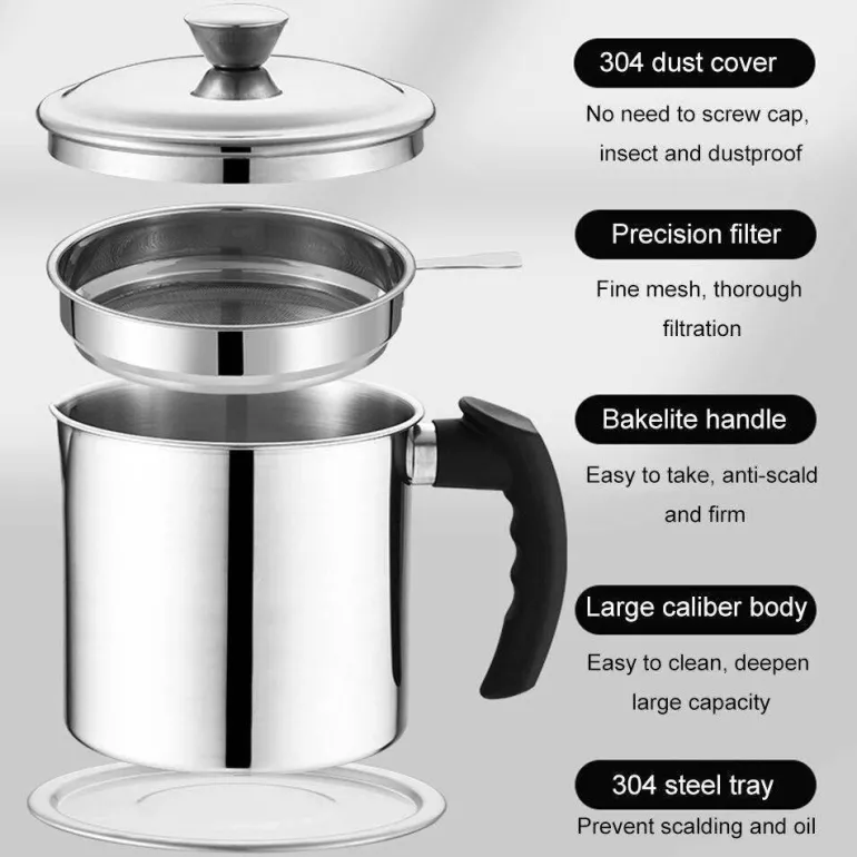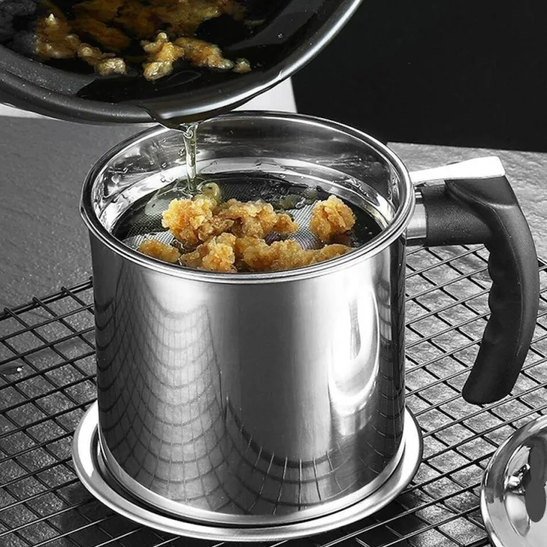 Das feinmaschige Sieb entfernt effektiv alte Teigreste aus Ihren gekochten Speisen und hält Ihr Speiseöl sauber und rein. Ein durchdachter Rand schützt vor Staubverschmutzung, während die rutschfeste Untersetzerschale verschüttetes Öl auffängt und so Ihre Arbeitsfläche sauber hält.