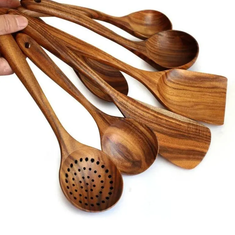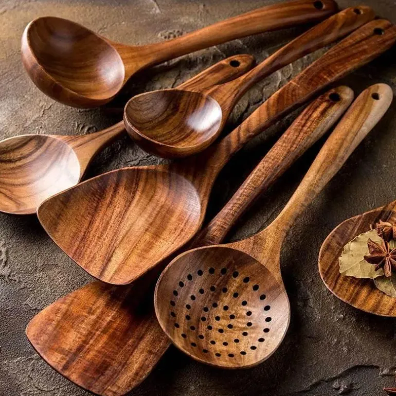 Veredeln Sie Ihr kulinarisches Erlebnis mit den Oksa Küchenutensilien, die Funktionalität und Stil in Ihre Küche bringen. Dieses 7-teilige Set aus hochwertigem Teakholz bietet Langlebigkeit und eine warme, natürliche Ästhetik, die Ihre Arbeitsplatte optisch aufwertet.