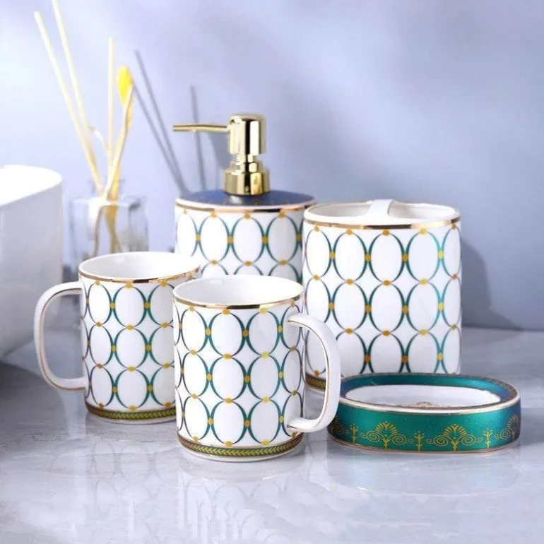Each piece showcases a solid hue that beautifully complements your decor, while the high-gloss finish adds an elegant touch to the overall aesthetic. Made from durable ceramic, the set features graceful curve detailing that not only enhances your bathroom’s decor but also functions efficiently on your countertop or vanity. Maintenance is straightforward—simply wash with mild soap and water to keep every item looking fresh.