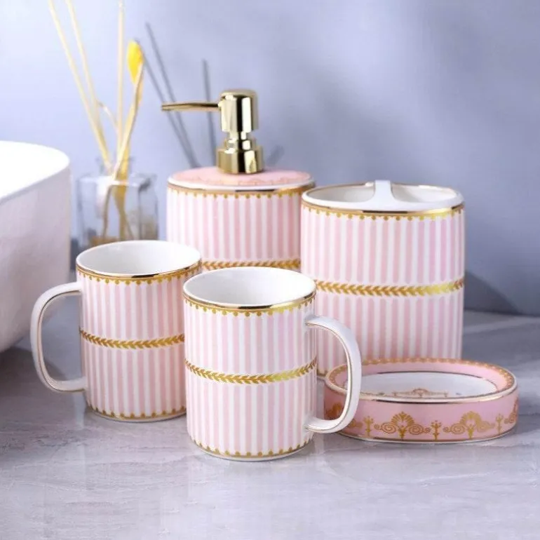 – Pieces Included: 1 lotion dispenser, 1 tumbler, 1 toothbrush holder, and 1 soap dish
