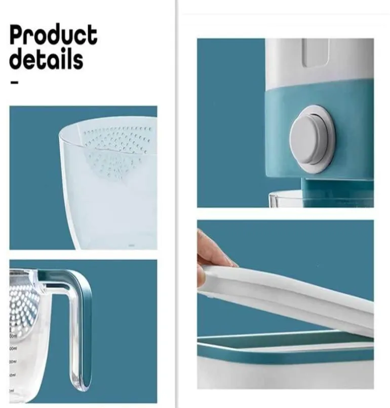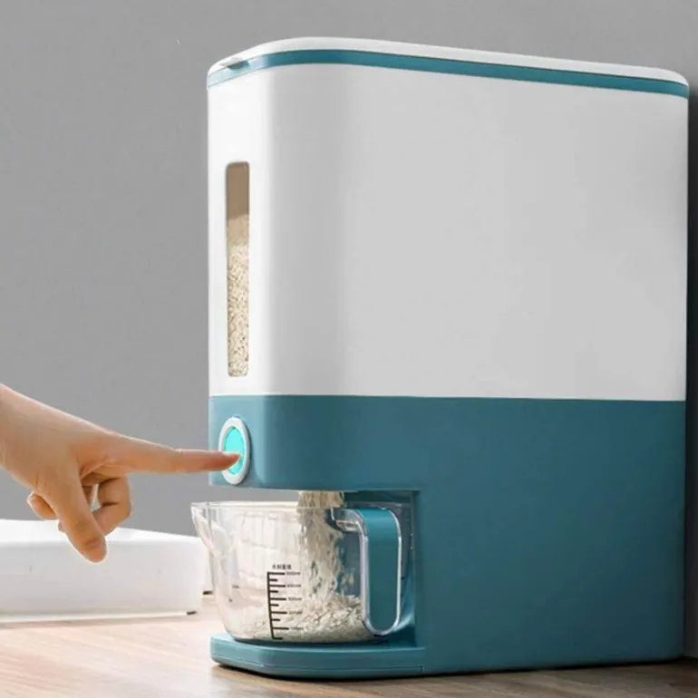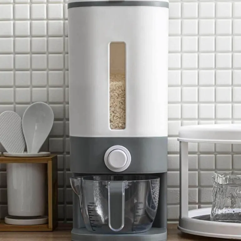 Dieser feuchtigkeitsbeständige Getreidebehälter ist speziell für die einfache Dosierung von Reis und verschiedenen Vollkornprodukten konzipiert. Mit einem einfachen Druck auf den runden Knopf können Sie Ihre Zutaten präzise und mühelos dosieren.