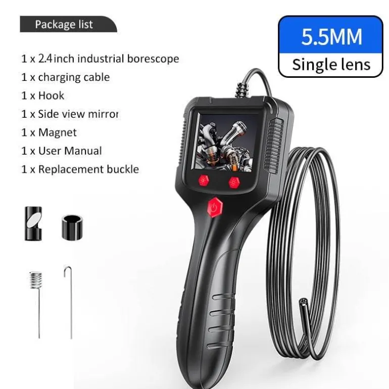 Zu den bemerkenswerten Spezifikationen gehören eine Auflösung von 1280 x 720 und 1920 x 1080 Pixeln, unterstützt durch eine Pixelanzahl von 2,0 MP. Die Kamera bietet eine Auswahl an Objektiven mit Durchmessern von 5,5 mm, 8 mm und 3,9 mm und einen Brennweitenbereich von 5–10 cm. Sie wird von einem robusten 2600-mAh-Akku betrieben und verfügt über eine übersichtliche Displayoption mit einem 2,4-Zoll- oder 2,8-Zoll-IPS-Bildschirm für sofortiges visuelles Feedback bei Inspektionen.