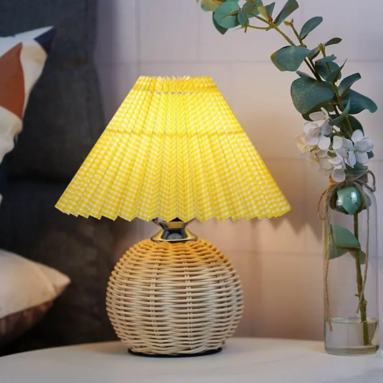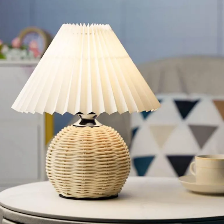 Verwandeln Sie Ihr Schlafzimmer mit unserer Rattan Plissee-Tischleuchte, die eine beruhigende Atmosphäre schafft. Dieses elegante Beleuchtungsstück besticht durch einen wunderschön plissierten Stoffschirm, der den fein gearbeiteten Rattanfuß perfekt ergänzt und Ihre Wohnkultur perfekt ergänzt.