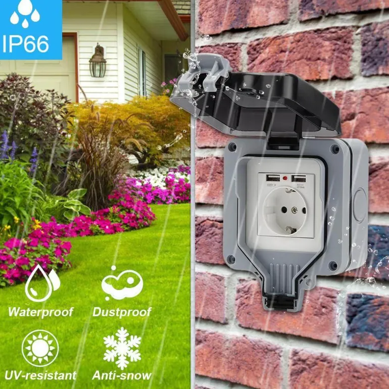 Diese robuste, wasserdichte Steckdosenabdeckung bietet zuverlässigen Schutz für elektrische Außeninstallationen. Sie ist ideal für Gärten, Werkstätten, Terrassen und Badezimmer und verfügt über die beeindruckende Schutzart IP66, die im geschlossenen Zustand eine sichere Wasserdichtigkeit gewährleistet. So können Sie sich auch bei rauen Wetterbedingungen auf eine sichere und zuverlässige Stromversorgung verlassen.