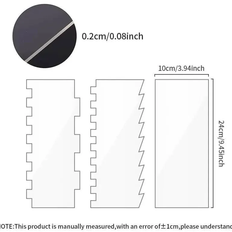 Jeder Schaber verfügt über eine speziell entwickelte Sägezahnkontur, die ein gleichmäßiges Auftragen ermöglicht und so die Zubereitung optisch ansprechender Leckereien erleichtert. Das ergonomische Design sorgt für einen komfortablen Griff und minimiert die Belastung der Hand beim Zubereiten Ihrer kulinarischen Meisterwerke.