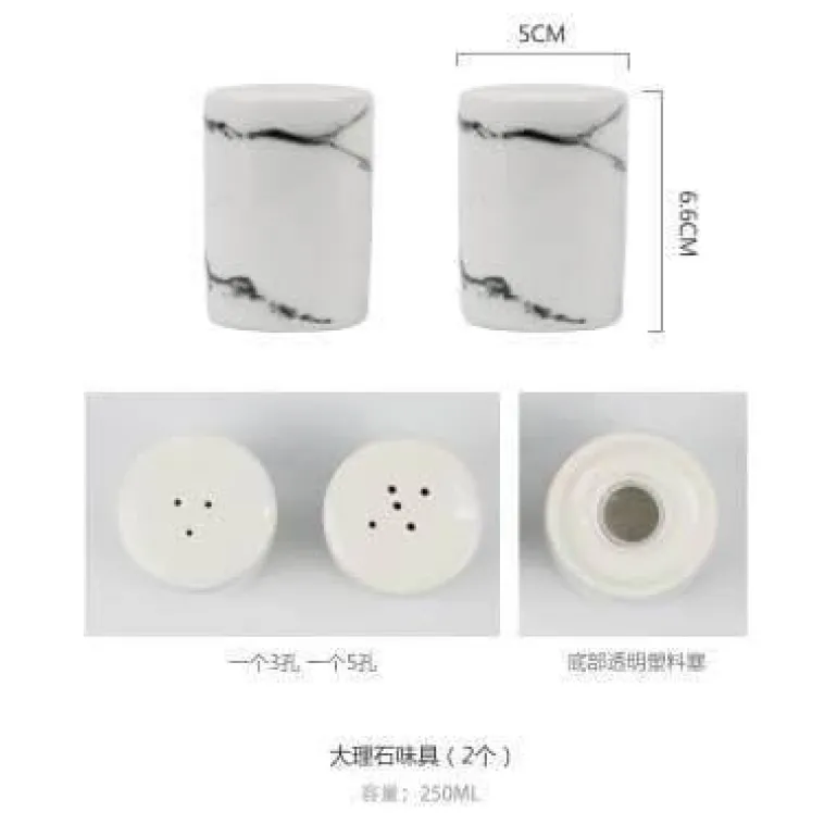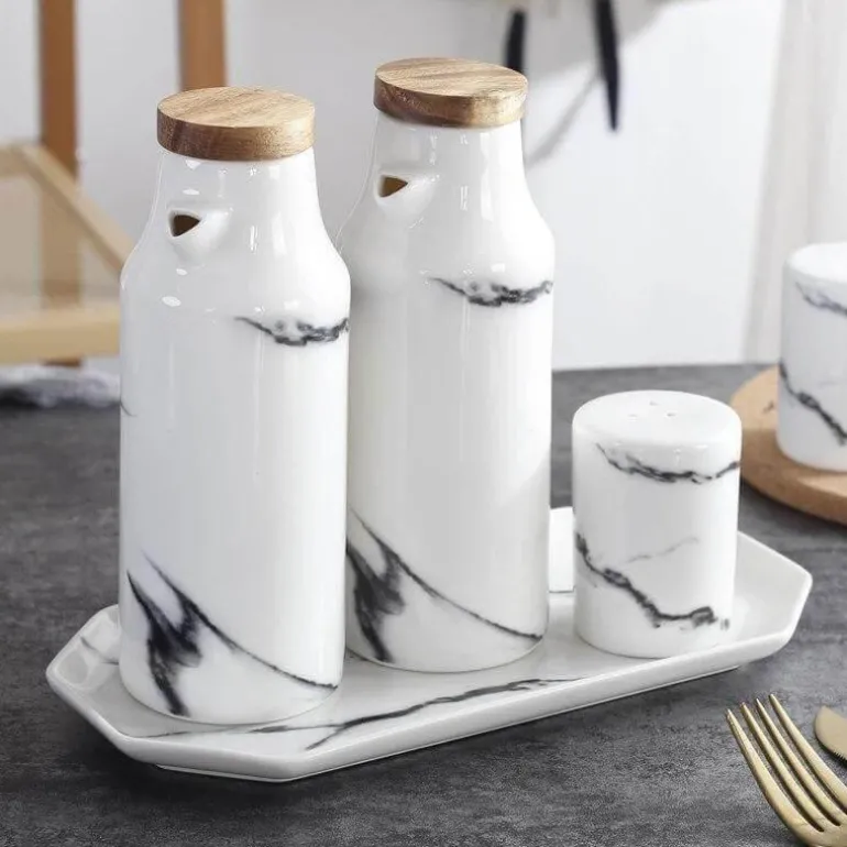 Dieses vielseitige Set eignet sich perfekt für eine Vielzahl von Gewürzen, darunter Sojasauce, Essig und Olivenöl, und ist somit eine unverzichtbare Ergänzung für jede Kücheneinrichtung. Das markante Marmordesign verleiht Ihrem Geschirr eine raffinierte Note, während die verwendeten umweltfreundlichen Materialien ein nachhaltiges Engagement widerspiegeln.