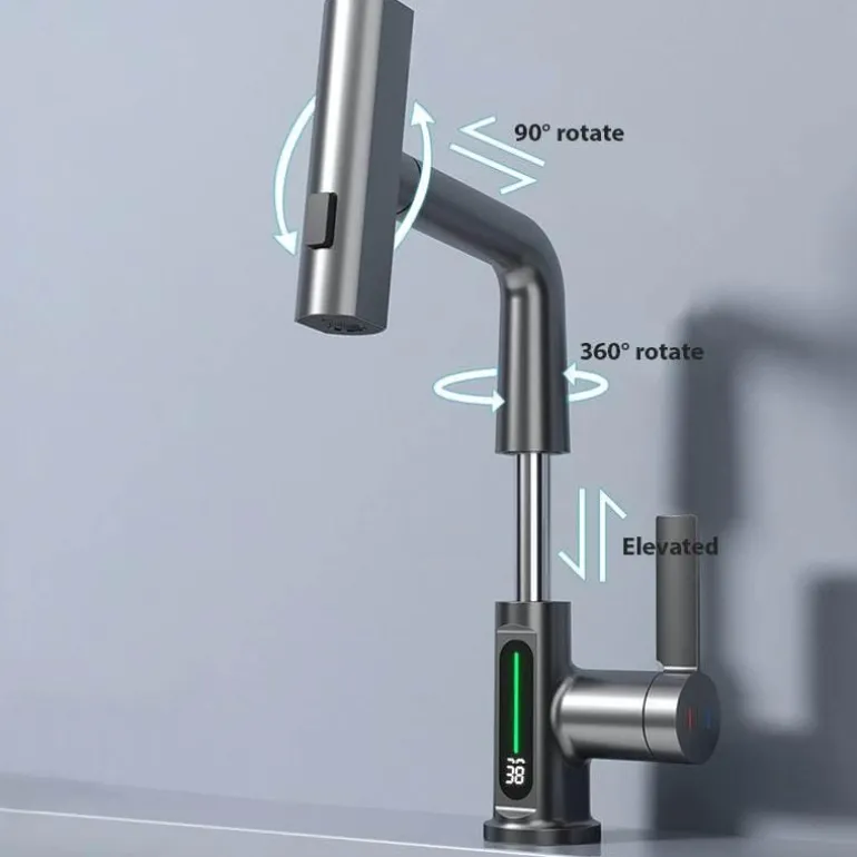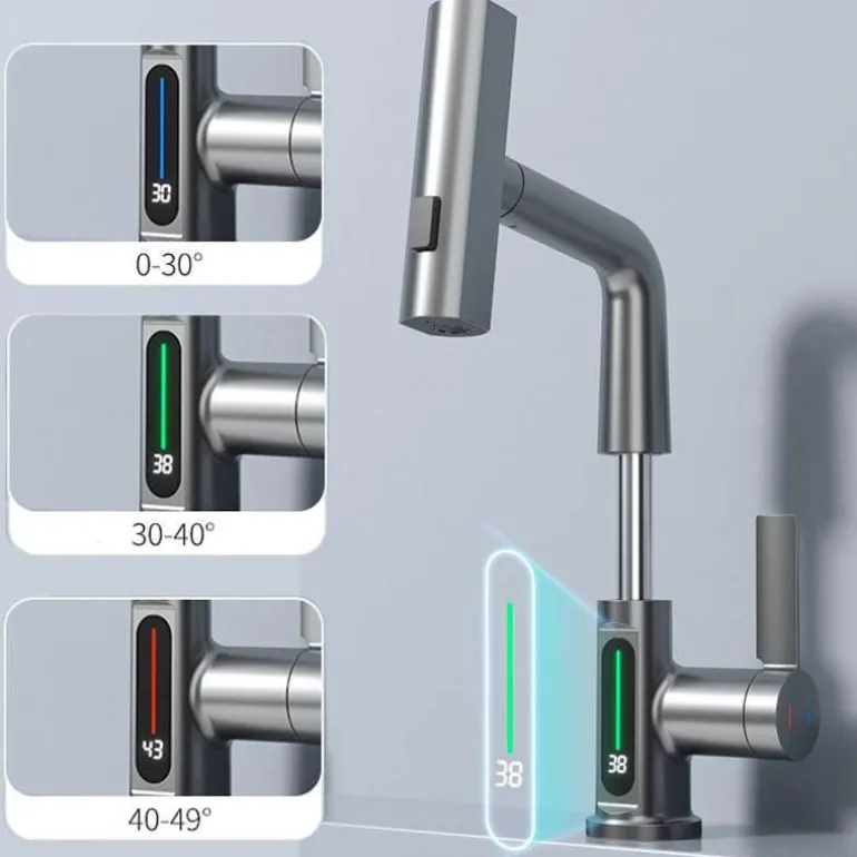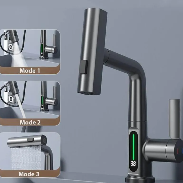 Werten Sie Ihr Zuhause mit dem modernen, eleganten Wasserfall-Wasserhahn mit praktischer Temperaturanzeige auf. Dieser Wasserhahn vereint Eleganz und Funktionalität und ist somit die ideale Ergänzung für Küche und Bad. Sein modernes Design, ergänzt durch den faszinierenden Wasserfall, schafft eine beruhigende Atmosphäre, während die integrierte Temperaturanzeige dafür sorgt, dass Ihr Wasser bei jeder Anwendung die optimale Temperatur hat.