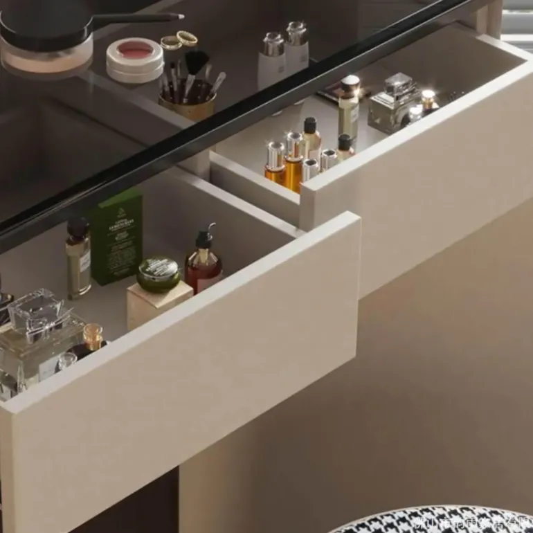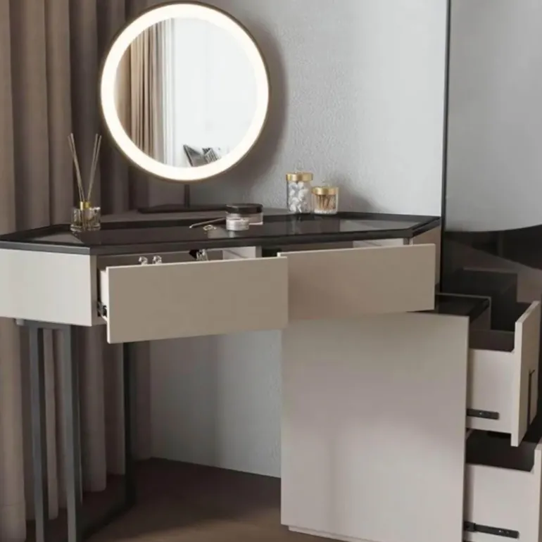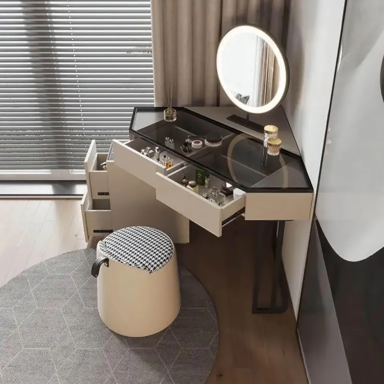 Entdecken Sie unseren wunderschön gestalteten Eck-Schminktisch, der Funktionalität und Eleganz perfekt vereint. Dieses elegante Möbelstück aus Massivholz besticht durch seine klassische Ästhetik und ist gleichzeitig langlebig. Die glatte Glasplatte unterstreicht die edle Optik, und die geräumigen Schubladen bieten ausreichend Stauraum für Ihre Kosmetikutensilien und sorgen für Ordnung und Ordnung. Der beleuchtete LED-Spiegel wertet Ihre tägliche Pflege zusätzlich auf und bietet die ideale Lichtquelle für präzises Make-up. Verwandeln Sie Ihren Raum mit diesem stilvollen und praktischen Schminktisch, der Ihren Schönheitsbedürfnissen gerecht wird.