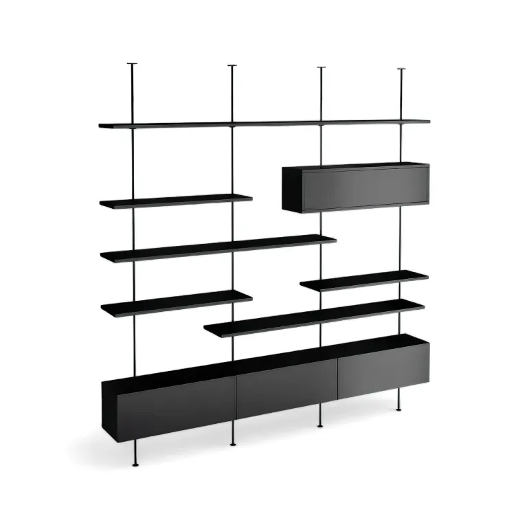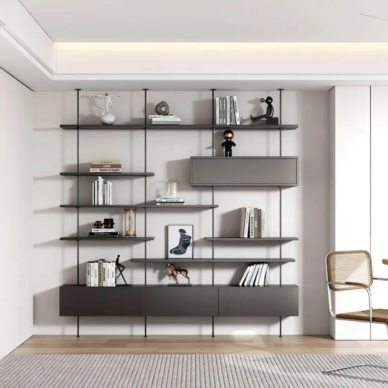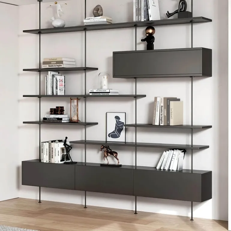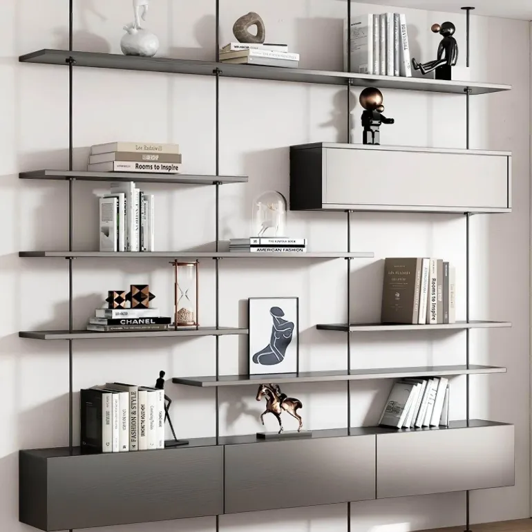 Erleben Sie mit diesem modernen, schwebenden Bücherregal eine wunderschöne Kombination aus modernem Design und praktischem Nutzen. Die robusten Edelstahlstangen, die vom Boden bis zur Decke reichen, sind nicht nur ein Blickfang in Ihrem Zuhause, sondern bieten auch beeindruckende Stabilität für Ihre Gegenstände.