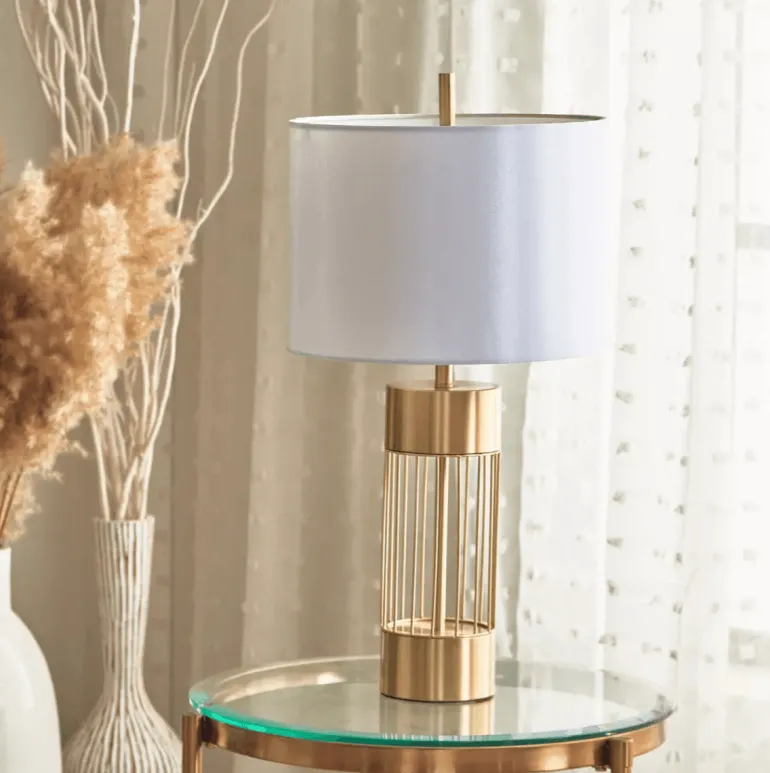 Discover the allure of modern design with this stunning table lamp that embodies both style and functionality. Inspired by the elegance and strength of a secure vault, the lamp features a sealed cylindrical base paired with luminous gold-finished metal rods that elegantly encase the inner light source. This thoughtful design not only enhances security but also adds a touch of sophistication to any room.