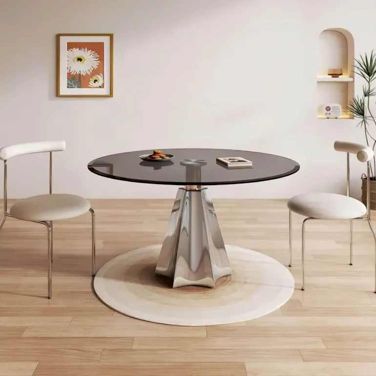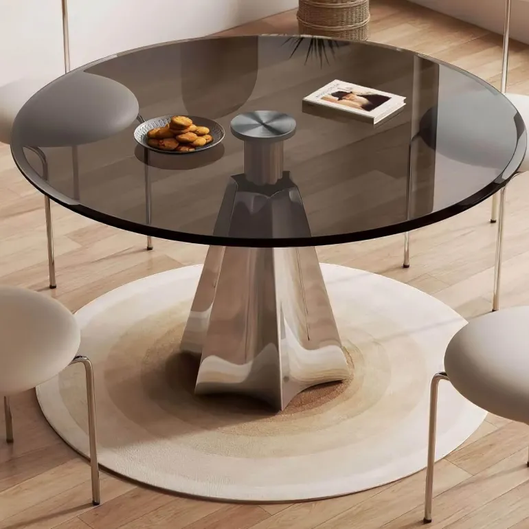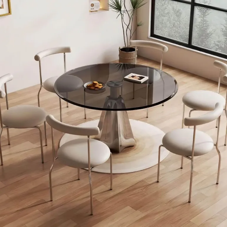 Die Tischplatte aus gehärtetem Glas ist sowohl schön als auch praktisch und bietet eine glatte Oberfläche, die Ihrem Essbereich eine edle Note verleiht. Das langlebige Material ist leicht zu reinigen und zu pflegen, sodass Ihr Tisch sowohl bei geselligen Zusammenkünften als auch bei alltäglichen Mahlzeiten ein Mittelpunkt bleibt.