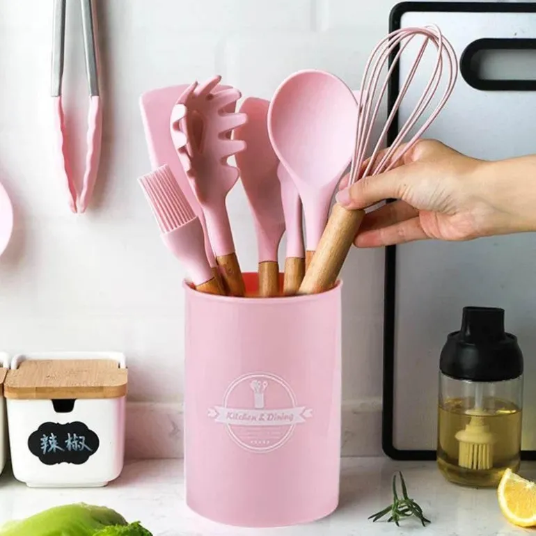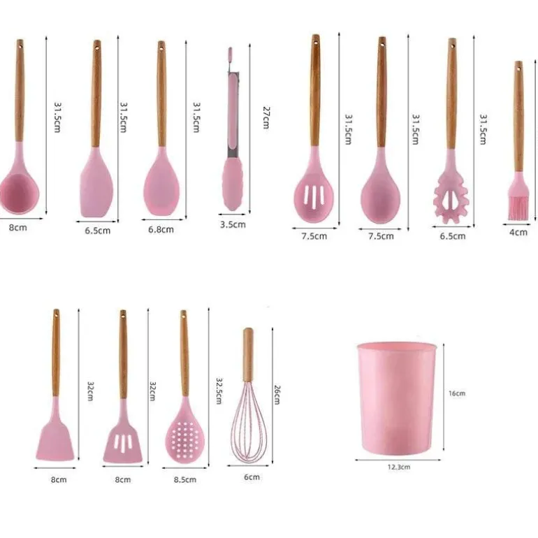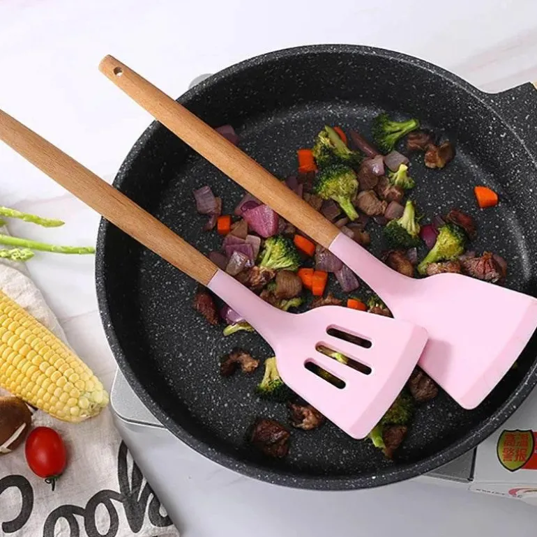 Erleben Sie die Vielseitigkeit unseres Silikon-Küchenutensilien-Sets mit eleganten Holzgriffen – ein Must-have für Ihre kulinarische Reise. Hergestellt aus hochwertigem Silikon bieten diese Utensilien eine perfekte Kombination aus Langlebigkeit und ansprechender Optik und eignen sich somit ideal für den täglichen Kochalltag.