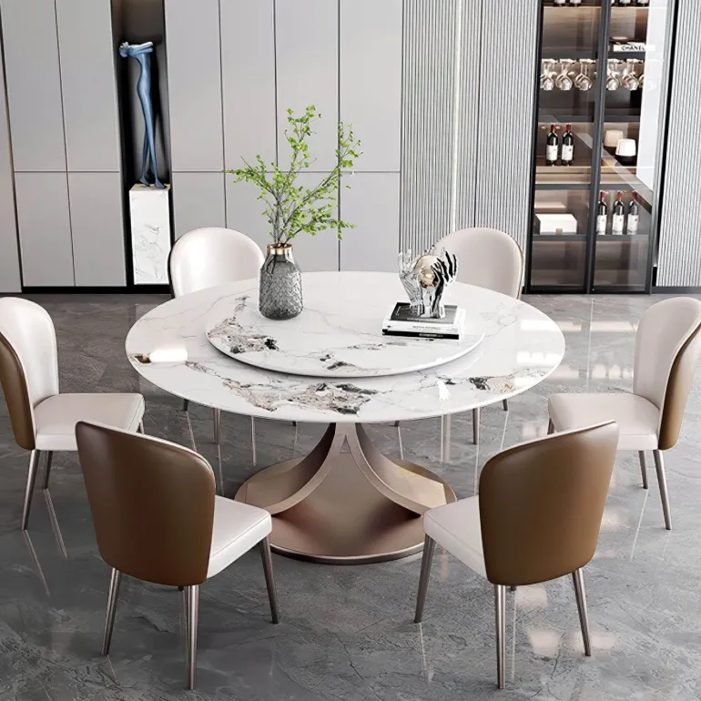 Ein innovativer Drehmechanismus verbessert die Funktionalität, erleichtert das Teilen von Speisen und fördert angeregte Gespräche unter den Gästen. Der elegant gestaltete Bronzerahmen verleiht eine raffinierte Note, die die natürliche Schönheit des Schiefers unterstreicht.