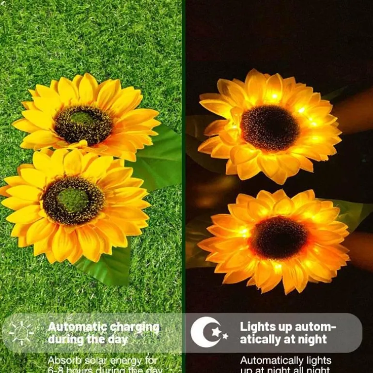 Verschönern Sie Ihren Außenbereich mit diesen eleganten, wasserdichten Solar-LED-Gartenleuchten in Sonnenblumenform. Sie verleihen Ihrem Garten, Rasen, Gehwegen, Ihrer Terrasse, Ihrem Deck oder Ihrer Einfahrt einen besonderen Charme. Tagsüber nutzen diese Leuchten effizient die Sonnenenergie und machen eine manuelle Bedienung überflüssig. Bei Einbruch der Dämmerung leuchten sie automatisch und schaffen eine warme und einladende Atmosphäre.